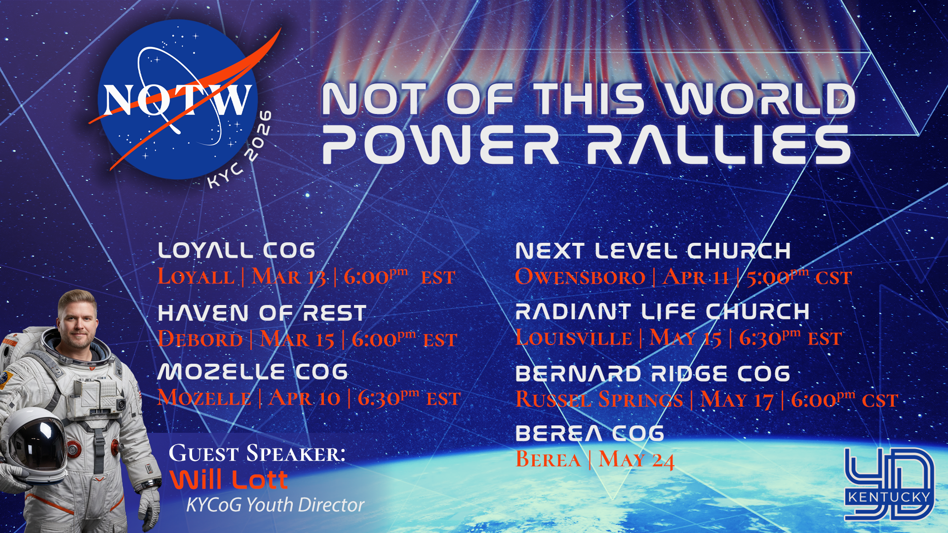 The Not Of This World Power Rallies are regional youth services happening across Kentucky designed to build momentum for KYC 2026, strengthen connections between churches, and ignite students with a passion to live boldly for Christ.